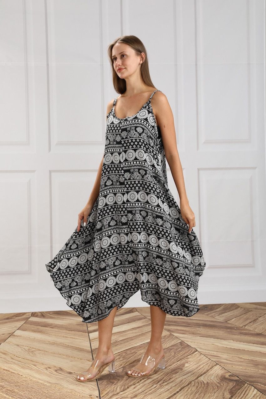 Asymmetric midi dress with a cape sleeve and bare shoulder. Print detail. One Size Fits Most.